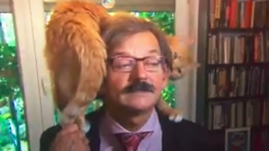 El académico solo atino a correr la cola del animal, que estaba tapándole la cara, pero siguió hablando ante la cámara como si nada hasta el final de la entrevista.