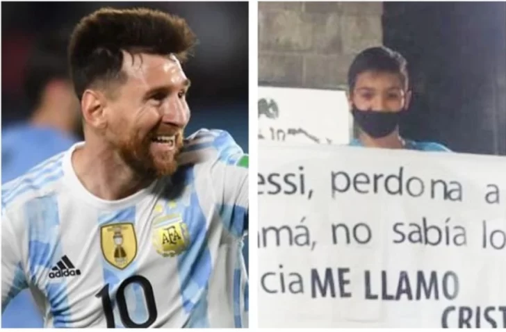 “Messi: perdoná a mi mamá. No sabía lo que hacía, me llamó Cristiano”, decía el mensaje del cartel que el pequeño Cristiano, tal es su nombre, sostenía en la entrada del predio donde la albiceleste está concentrada para el partido contra los incaicos.