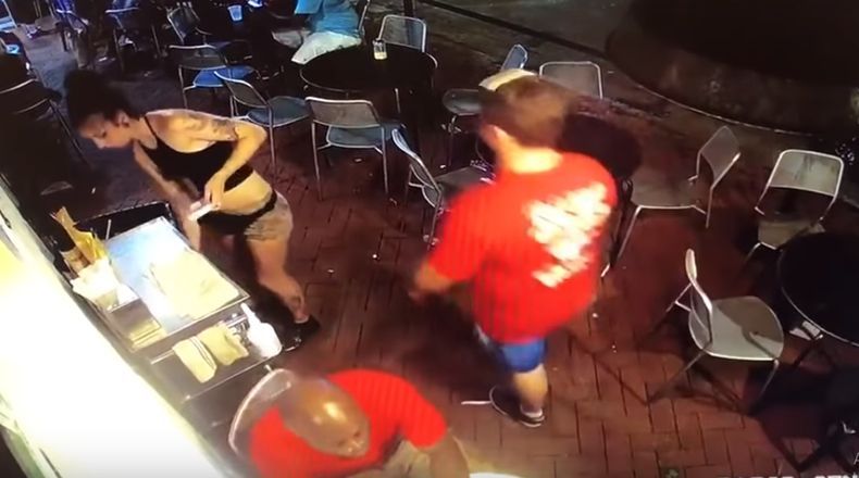 El repudiable comportamiento de un hombre y la reacción ante ello de una moza quedó registrado en las cámaras de seguridad de un restaurante en Savannah, Georgia, Estados Unidos.