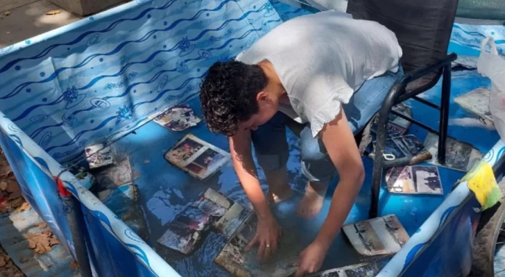 Pero justo cuando estaba por perder la esperanza, tres compañeras de trabajo fueron a ayudarlo y recuperaron el 80% del material. ¿Cómo? Separaron los bloques de fotografías y limpiaron una por una en una pileta de lona.
