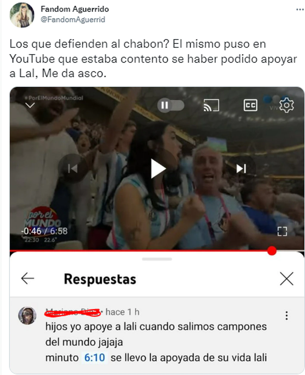 “Hijos yo apoyé a Lali cuando salimos campeones del mundo jajaja minuto 6.10 se llevó la apoyada de su vida Lali”, escribió Mariano Díaz, orgulloso de la repudiable situación.