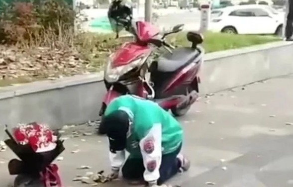 El joven chino fue hasta un edificio de oficias donde trabaja su ex pareja con un ramo de flores y se arrodilló. Allí permaneció por 21 horas (llegó a las 13.00 del 28 de marzo y se fue a las 10.00 del día siguiente).