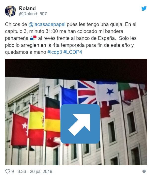 Precisamente quienes utilizaron la red social de Twitter para mostrar su rechazo fueron los panameños. Es que en el capítulo número 3 de la serie La Casa de Papel, hay una escena que transita delante del Banco Nacional de España en donde se puede ver las banderas de varios países, entre ellas, la de Panamá. El problema fue que la insignia está completamente al revés y no pasó desapercibido.