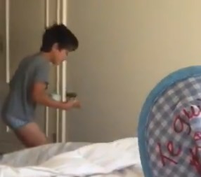 En las imágenes del video viral se ve a un nene en bóxer y remera sosteniendo una bandeja con el desayuno para su mamá, pero antes de llegar a la cama se le cae todo al piso.
