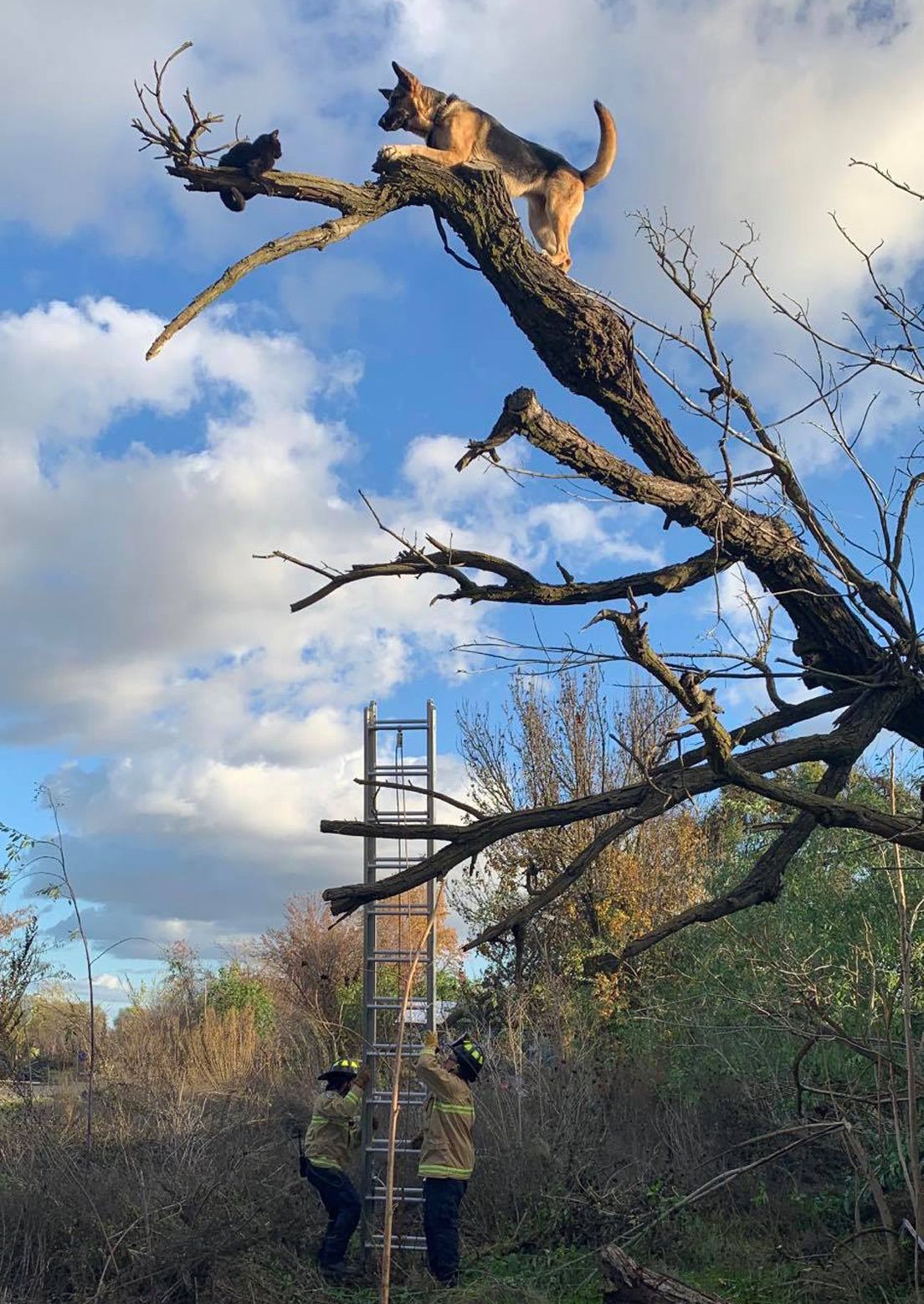 El entusiasmo de un pastor alemán por atrapar al gato lo llevó a trepar varios metros, hasta encontrarse a pocos pasos del felino, en un punto en el que ninguno de los dos animales podían hacer ningún movimiento más.
