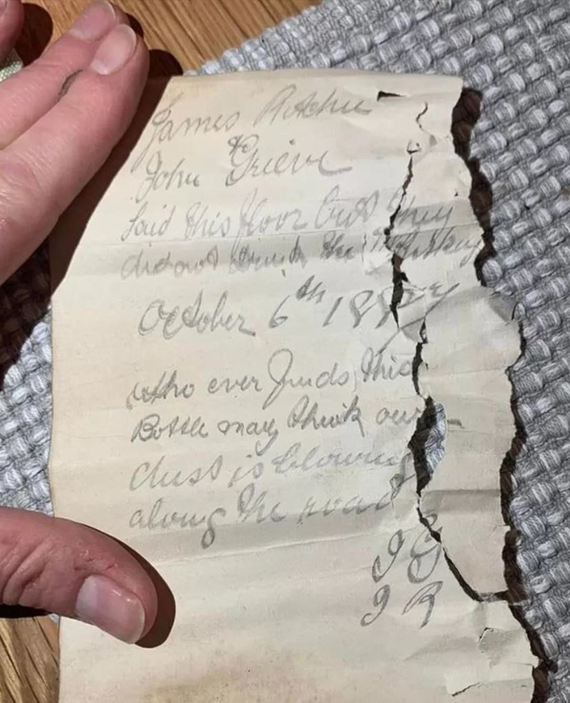 La nota, firmada por dos trabajadores, decía: "James Ritchie y John Grieve pusieron este piso, pero no bebieron el whisky. 6 de octubre de 1887".