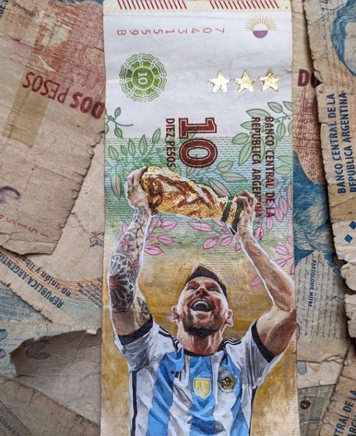 “Mucha gente que se enteró de que estaba pintando sobre los billetes, se acercaban a mi casa para regalármelos. Una señora me trajo billetes de los años 70 y 80 y también me enviaron desde Buenos Aires. En los últimos meses, por la fiebre mundialista, muchos me encargaron billetes con la cara de Messi”, explicó.