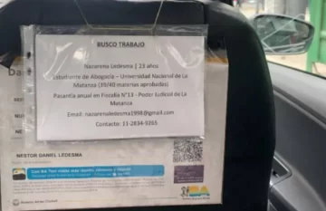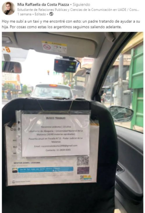 “Busco trabajo”, decía el pequeño cartel que colgaba del asiento delantero del taxi. Debajo, se encontraba el nombre de la joven, sus estudios avanzados en derecho, y los lugares donde había trabajado. El CV pertenecía a Nazarena Ledesma y lo había “publicado” en el asiento del automóvil su propio padre, el taxista Néstor Ledesma.