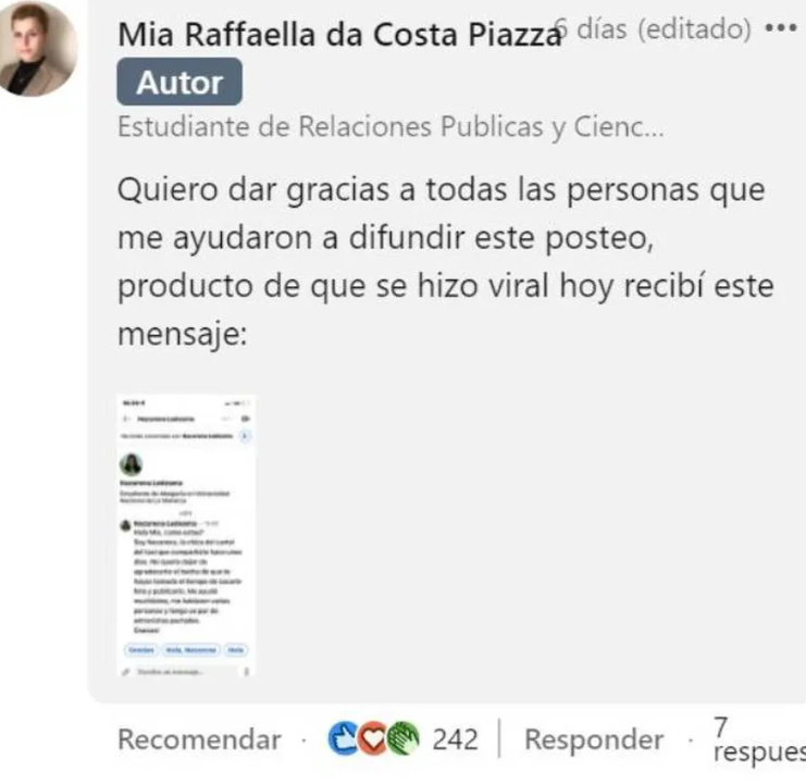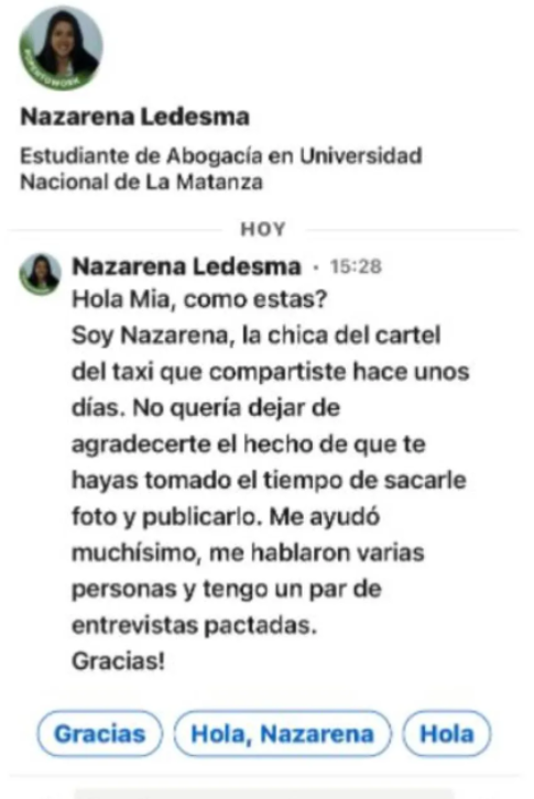Pero la frutilla del postre, casi el final feliz de esta historia, se dio unos días después de que da Costa Piazza subiera la foto del currículum. Es que la misma Nazarena Ledesma, la joven a la que su padre taxista había ayudado difundiendo sus datos, le escribió un mensaje privado a la usuaria de LinkedIn. En él, le agradecía por haber posteado esa foto y le aseguraba que ya había obtenido entrevistas de trabajo gracias a la publicación.