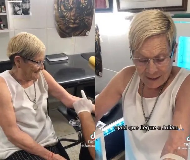 "Llevamos a mi abuela a que cumpla el sueño de su primer tatuaje por Julián Álvarez", comienza el video. "Si me ves llorar, no es de dolor sino de emoción", explicó la mujer antes de que comenzaran los pinchazos.