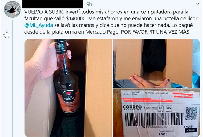 Luego de despegar la cinta embaladora, metió la mano para sacar el producto e inmediatamente notó que algo no andaba bien. Lo comprobó cuando abrió la caja del todo. No había notebook sino una botella de licor de cacao Tres Plumas, aunque sea llena. La transacción terminó en múltiples reclamos y hasta una denuncia en la Justicia. El conflicto fue resuelto, pero en el medio algo extraño pasó, fuera del guion usual de las estafas cometidas contra usuarios de la plataforma que buscan explotar debilidades y transacciones realizadas fuera del sistema.