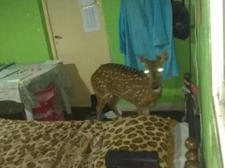 Se trata de un ejemplar de ciervo axis, comúnmente conocido como "bambi", que estaba lastimado y asustado, por lo que aprovechó que la puerta estaba abierta para entrar al domicilio y refugiarse.