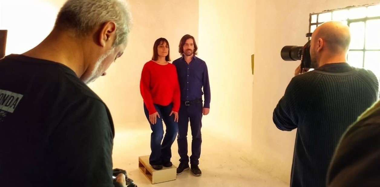 En la foto de cuerpo entero se puede ver a Del Plá parada sobre una tarima como las que se usan para nivelar la altura con una pareja en una foto, pero a la vez, la mujer flexiona las rodillas para agacharse.