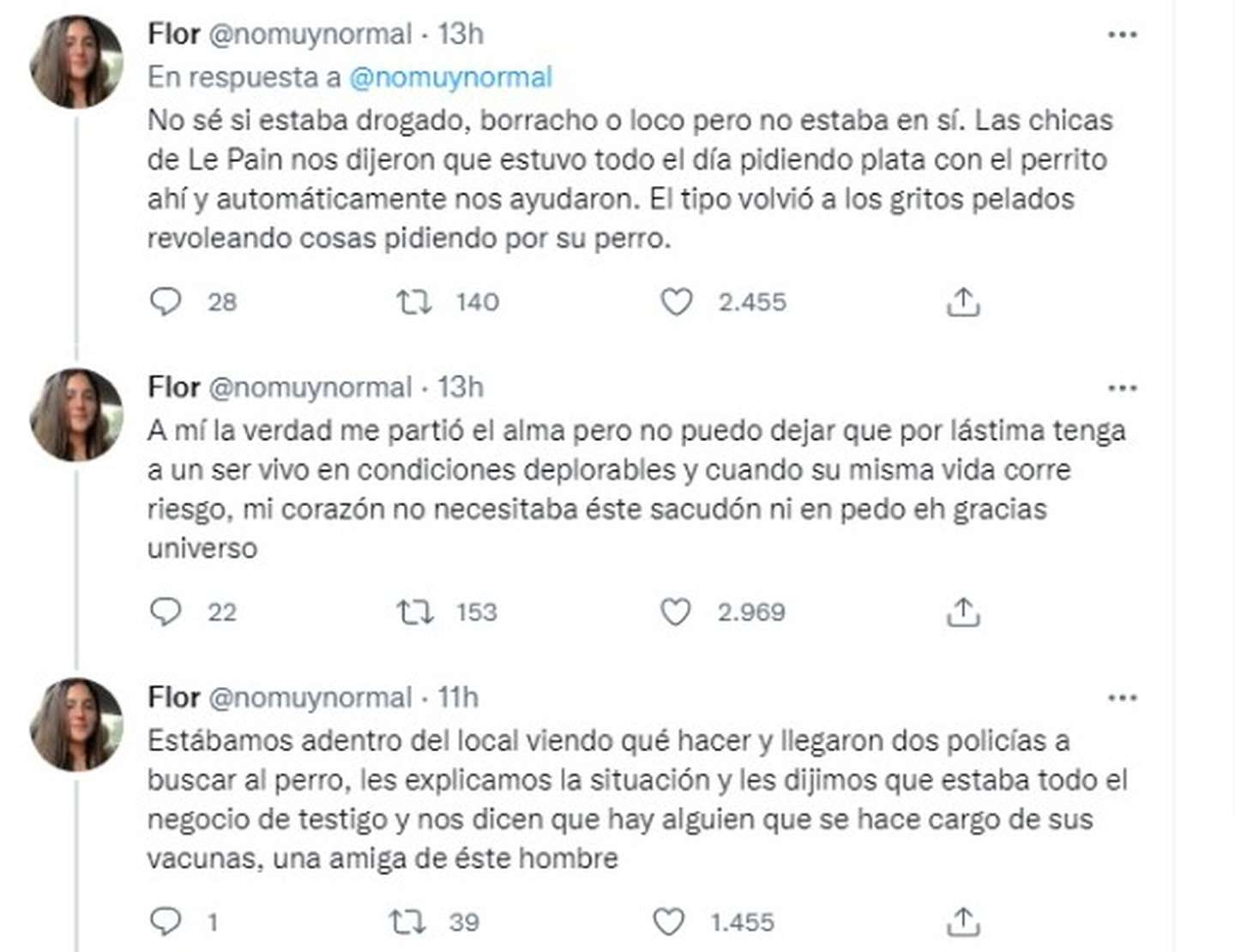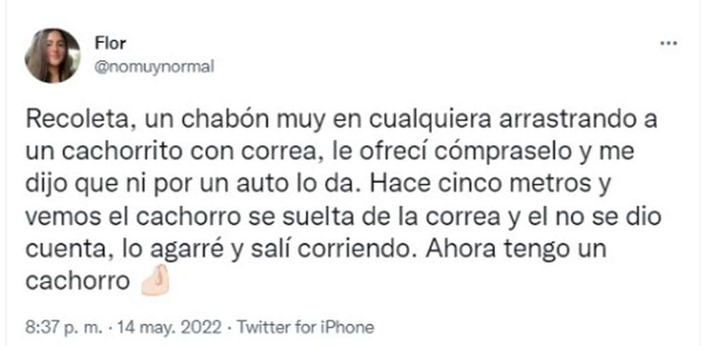 “Recoleta, un chabón muy en cualquiera arrastrando un cachorrito con correa, le ofrecí comprárselo y me dijo que ni por un auto lo da”, escribió Flor, la joven que se llevó al perro, en sus redes sociales.