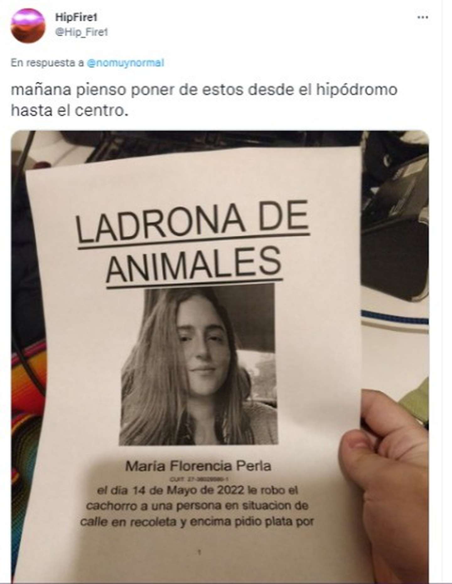 “Mañana pienso poner de estos desde el hipódromo hasta el centro”, escribió el usuario @hip_fire1 junto a un cartel que reza “ladrona de animales”.