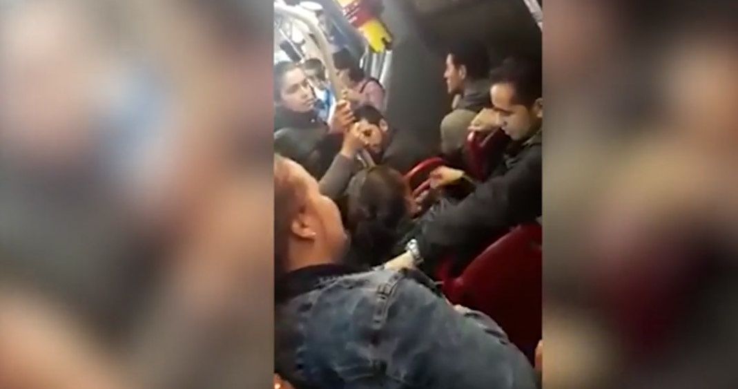 Uno de los pasajeros grabó el momento en el que la mujer le reclama a su esposo, por sus mentiras. ¡"No que estaba trabajando…!", le grita mientras intenta pegarle a la supuesta amante.
