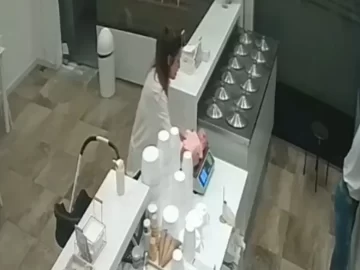 En ese momento la empleada se da vuelta y ve la situación, pero se ríe y continúa preparando el pedido. La mamá también sonríe y continúa.
