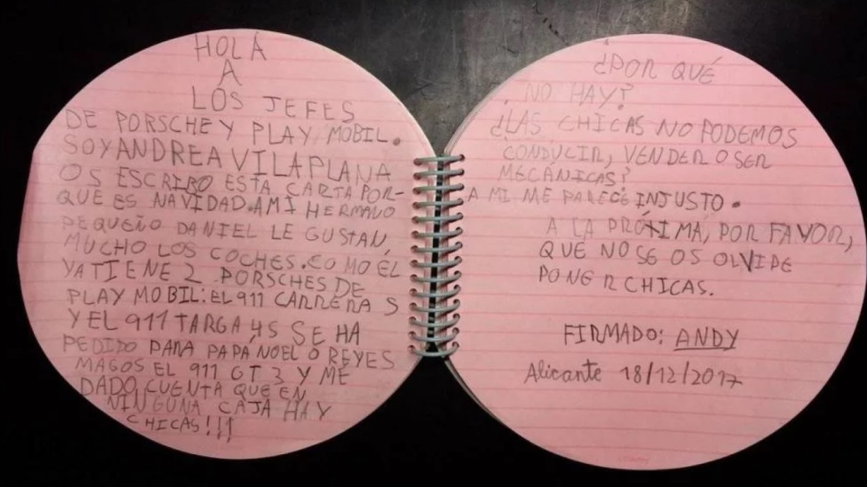 Andrea Vilaplana vive en Alicante, España, y escribió una carta dirigida a la automotriz Porsche y al fabricante de juguetes Playmobil cuestionando por qué sus autitos siempre son manejados por varones: “¿Las chicas no podemos conducir, vender o ser mecánicas? A mí me parece injusto”.