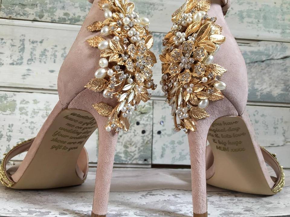 "Quería que tuvieras un regalo de mi parte en el día de tu boda. Tus zapatos de boda son mi regalo para ti", puede leerse en la suela de uno de los zapatos. "Espero que tengas un día mágico. Mucho mucho amor y abrazos. Mamá xxxx", se lee en la suela del otro.