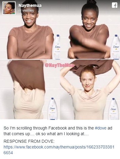 La conocida marca de cuidado personal Dove quedó envuelta en una polémica, luego de publicar un anuncio en la red social Facebook donde una mujer negra se convierte en blanca luego de usar el jabón de la línea de productos.