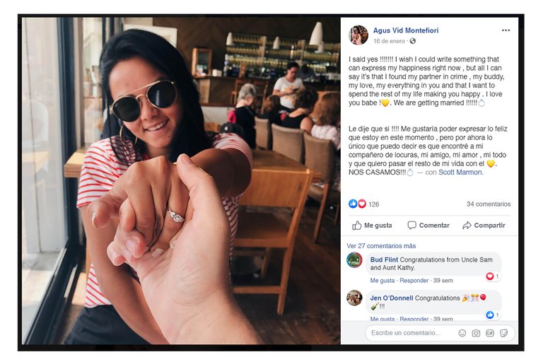 “Le dije que ‘Sí’. Me gustaría poder expresar lo feliz que estoy en este momento, pero por ahora lo único que puedo decir es que encontré a mi compañero de locuras, mi amigo, mi amor, mi todo y que quiero pasar el resto de mi vida con él. ¡¡¡NOS CASAMOS!!!”, escribió Agustina en su cuenta de Facebook el 16 de enero pasado.