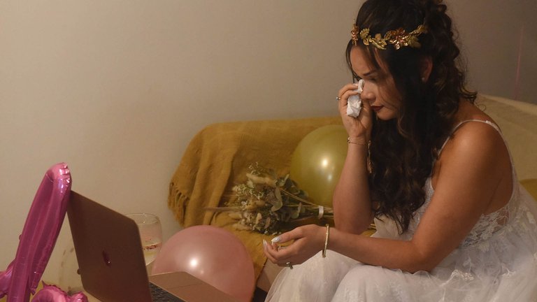 Ella llevaba puesto un vestido blanco y una corona de flores dorada. Él, un traje negro con una camisa blanca, sin moño ni corbata. A diferencia de un típico casamiento en un Registro Civil, esta unión se realizó vía zoom porque novia y novio estaban a casi 10 mil kilómetros de distancia.