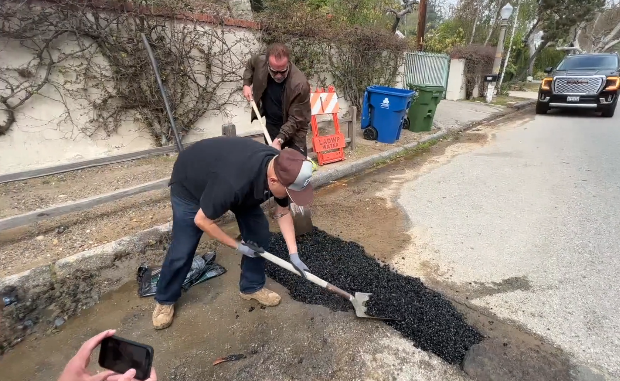 El ex gobernador de California dijo que su vecindario lleva semanas esperando a que se arregle un bache. Así que consiguió un poco de cemento y realizó el trabajo él mismo con la ayuda de su equipo.