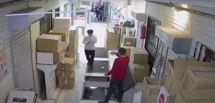 Las imágenes corresponden al reciente lunes, donde el afectado se ve caminando al interior del lugar mientras revisaba su celular, mientras que otro trabajador dejaba paquetes en la bodega subterránea.
