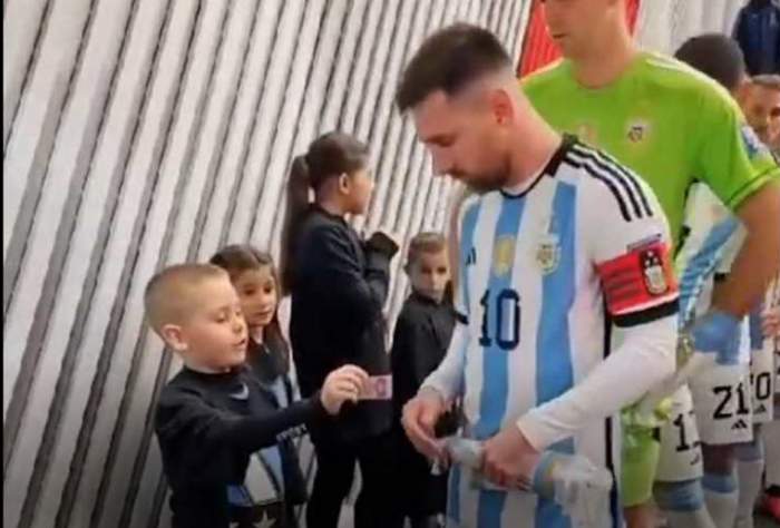 El pequeño tocó tímidamente al capitán y le entregó figuritas doradas. La "Pulga" se las entregó a una persona del cuerpo técnico para que se las guardara pero el "Dibu" las pidió y se las colocó en la canillera.