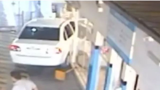 Según se puede ver en el video, el hombre intenta acomodar el auto para continuar con el chequeo, pero por motivos que se desconocen, perdió el control e impactó directamente contra las oficinas administrativas del lugar.
