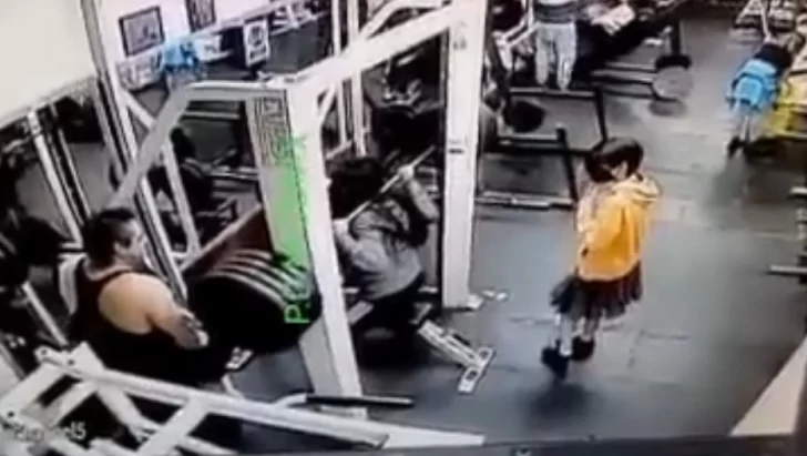 En las imágenes se puede ver a la víctima con un suéter gris y un pantalón negro junto a otras dos personas: una mujer vestida de amarillo, que la acompaña en su rutina de ejercicios, y un hombre que observa de cerca y parece ser quien la ayuda a acomodar el peso.