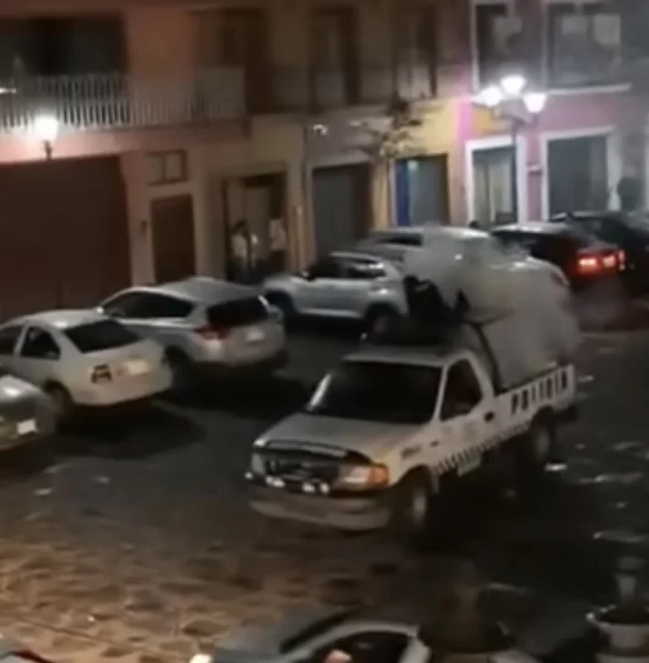 En la grabación, que circula en las redes sociales, se observa cómo uno de los cohetes se eleva y cae directamente sobre la patrulla, estallando en la parte trasera de la unidad.