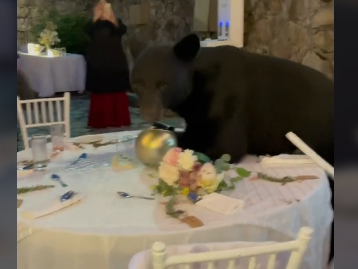 Acto seguido, el oso se acerca a otra mesa con invitados, uno de los cuales grita: "¡no te muevas!", mientras otro ni se inmuta y sigue comiendo. Poco después, el animal se aleja del banquete, quedando el incidente en un susto.
