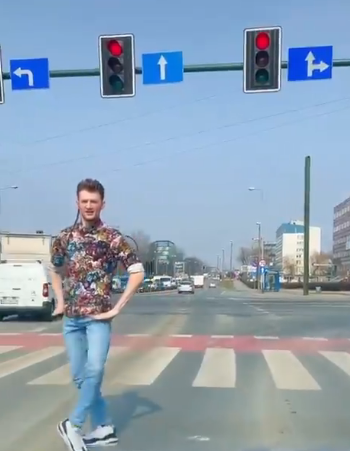 Lo aún más curioso del video es que el protagonista está dándolo todo en plena autopista al ritmo del Rey del Pop y una mujer que justo cruza por la senda peatonal parece que ni siquiera repara en el show de danza gratuito que se está desarrollando mientras el semáforo está en rojo.