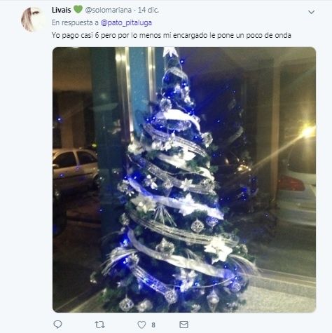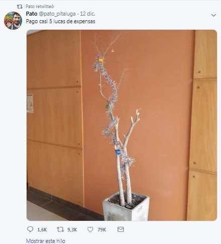 Patricio Pitaluga no se conformó que con la maceta que vio en la entrada, con un árbol prácticamente seco, al que apenas le colocaron una guirnalda gris y dos globos de colores y subió una foto a internet para que otros usuarios digan si él está equivocado o si realmente merecen algo mejor.