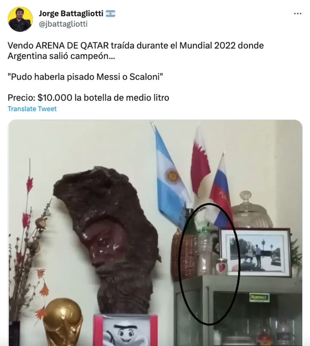 Un periodista deportivo de la ciudad de Santa Fe fue a trabajar al Mundial de Qatar 2022 y al volver decidió vender arena de las playa de Doha a $ 10.000 la botellita.