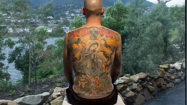 El suizo Tim Steiner es una obra de arte en movimiento. Toda su espalda está cubierta por un colorido tatuaje ideado por el artista belga Wim Delvoye.