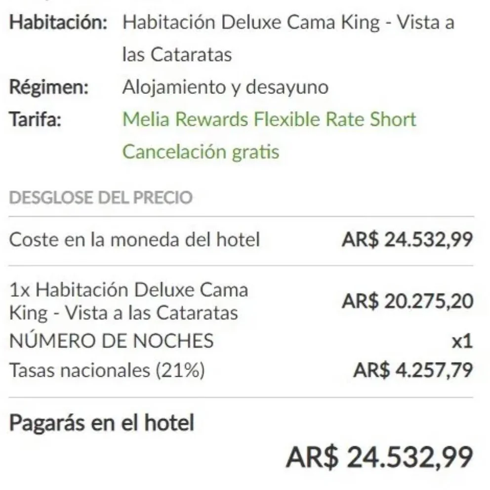 Una vez que llegue a Iguazú, Adrián se hospedará en el Gran Meliá Iguazú, dentro del Parque Nacional, que tiene vista a las Cataratas. Al igual que ocurrió con el aéreo, se las ingenió para abonar menos $8 mil la noche en ese complejo 5 estrellas.