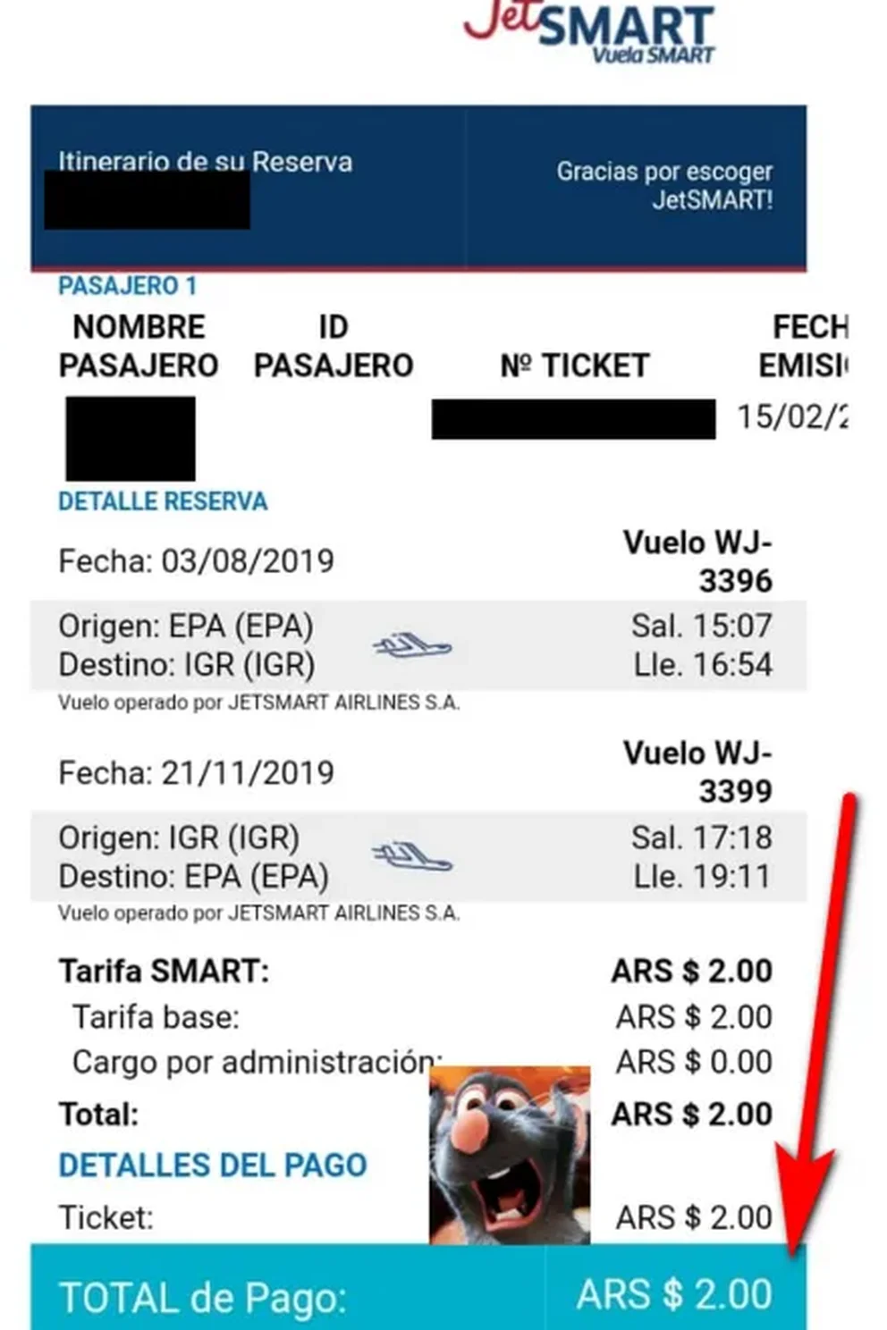 “Cataratas, vuelo conseguido a 2 pesos”, respondió Adrián junto a la captura de la compra del ticket donde podía observarse el irrisorio precio abonado para volar entre el 23 y el 26 de septiembre de este año por Jet Smart.