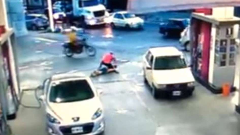 Un hombre golpeó a un motochorro hasta dejarlo inconsciente en una estación de servicios de Buenos Aires. La violenta escena quedó registrada en video. El delincuente había intentado robarle al joven cuando viajaba en moto junto a su novia.
