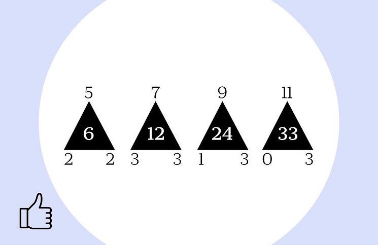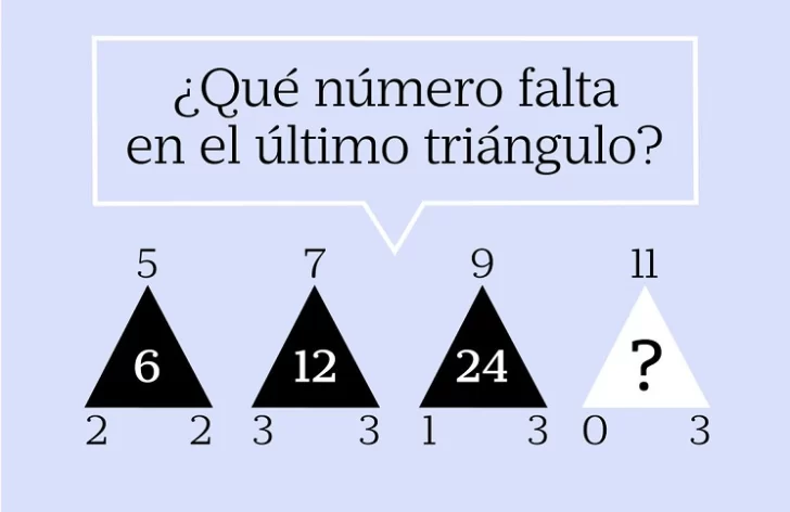 La imagen tiene 4 triángulos y números en cada uno de los vértices. El acertijo matemático propone pensar y encontrar el numero que falta adentro de la última figura geométrica.