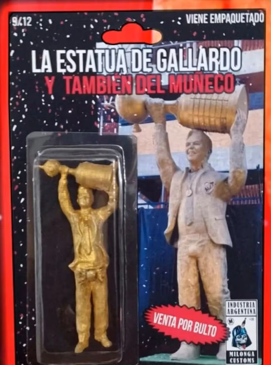 “La estatua de Gallardo y también del Muñeco”, dice en la caja del juguete que incluye una etiqueta que dice “venta por bulto” y la leyenda “viene empaquetado”.