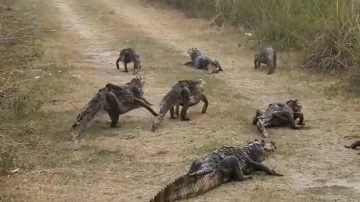Las imágenes de estos animales intentando huir de los incendios se viralizaron en las redes. La más conmovedora es la de un grupo de yacarés, que están en peligro de extinción, escapando junto a sus crías.