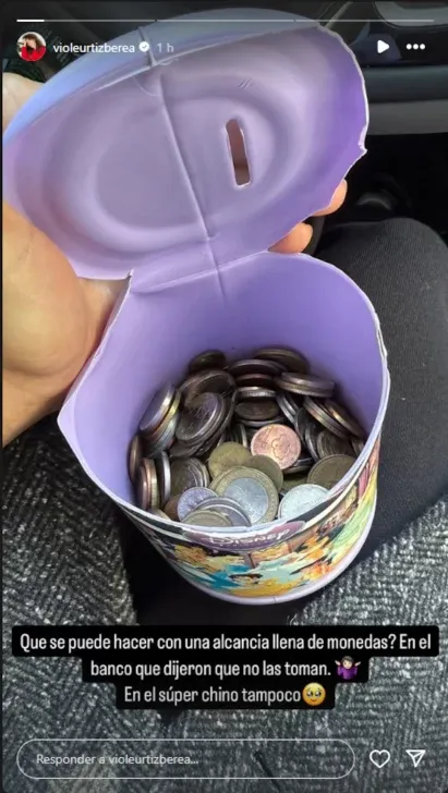 Violeta Urtizberea no ocultó su desconcierto al ver que un banco rechazó las monedas de la alcancía de su hija Lila. La actriz pidió ayuda a sus seguidores al ver que no le toman los ahorros en ningún lado.