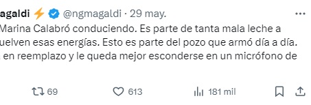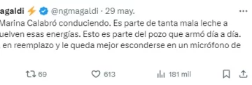“Que error Marina Calabró conduciendo. Es parte de tanta mala leche a colegas. Vuelven esas energías. Esto es parte del pozo que armó día a día. Pude verla en reemplazo y le queda mejor esconderse en un micrófono de radio”, escribió Magaldi en X (ex Twitter).