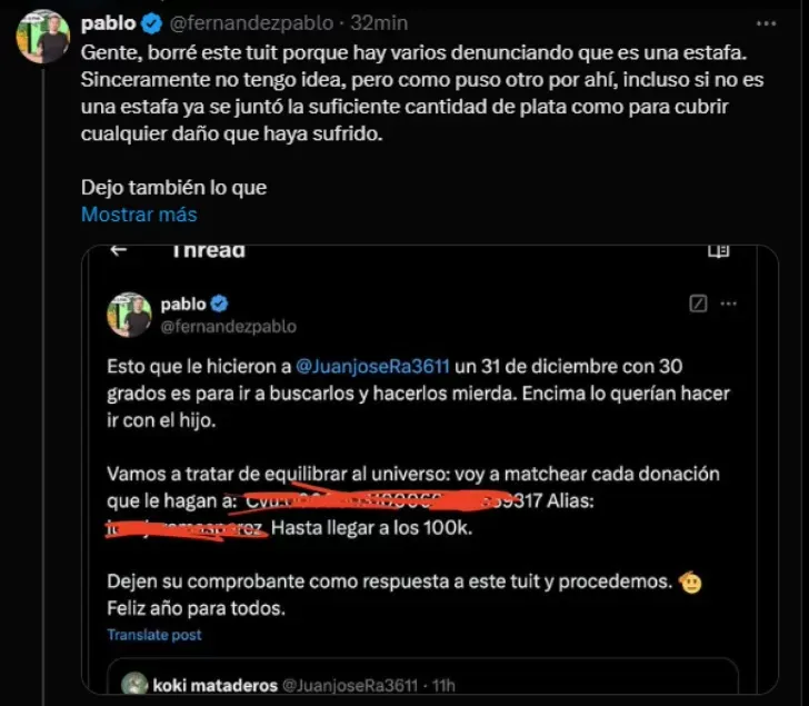 Las reacciones no solo fueron de empatía, sino también de desconcierto al descubrir más detalles sobre el perfil del joven. Muchos usuarios de X comenzaron a investigar su cuenta, revelando que este joven frecuentemente publicaba historias similares, siempre presentándose como víctima y buscando donaciones, ya que adjuntaba siempre su CVU y datos para recibir dinero, exclusivamente. Al parecer, evitaba aceptar ofertas de trabajo, y se dedicaba a crear relatos de desesperación para atraer la generosidad ajena. Algunos usuarios incluso señalaron que sus relatos parecían demasiado elaborados para ser ciertos, sugiriendo que podría tratarse de un perfil falso dedicado a estafar a través de historias que conmovieran y generaran actos de solidaridad, lo cierto es que este relato esta vez escaló tal nivel que el joven terminó cerrando su cuenta en X, falsa claramente.