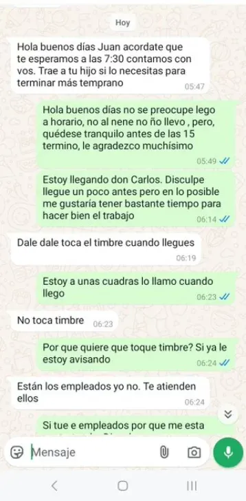 En los chats se puede leer la conversación completa: “Hola, buenos días Juan. Acordate que te esperamos a las 7:30. Contamos con vos. Traé a tu hijo si lo necesitás para terminar más temprano”, le escribió el estafador. A esto, él le respondió: “Hola, buenos días. No se preocupe, llego a horario. Al nene no lo llevo, pero quédese tranquilo que antes de las 15hs termino. Le agradezco muchísimo”.