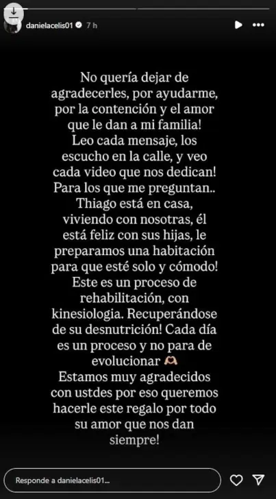 Daniela también reveló que el papá de sus hijas está recuperándose de una desnutrición, algo que se sospechaba por el cambio físico de Thiago. “Cada día es un proceso y no para de evolucionar”, cerró.