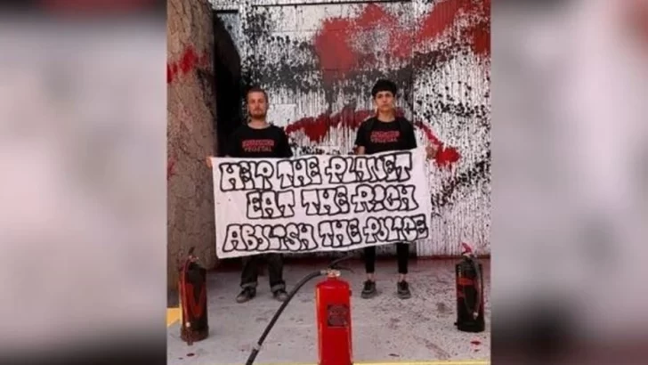Los miembros de esta organización divulgaron imágenes frente a la casa cerca de Cala Tarida, en la costa oeste de Ibiza, con una bandera con la leyenda que decía “Ayuda al planeta, cómete un rico. Abolir la policía” escrito en inglés. Luego aparecen los dos activistas lanzando pintura roja y negra a la fachada blanca del inmueble.