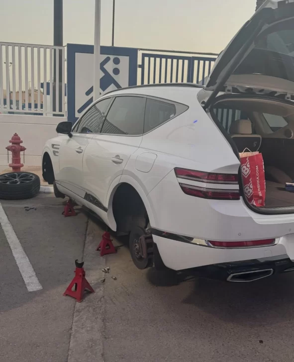 En la última foto publicada en su cuenta de Instagram (@neymarjr) se puede ver cómo tuvieron que levantar la camioneta de Lodi para cambiarle ambas ruedas. Una broma, en forma de venganza, muy pesada.